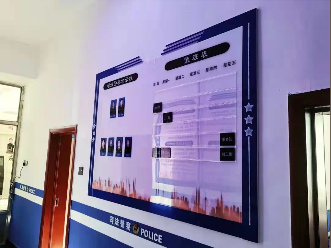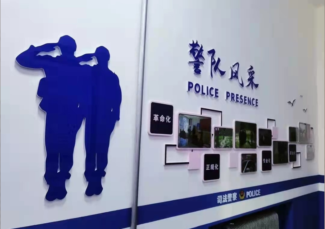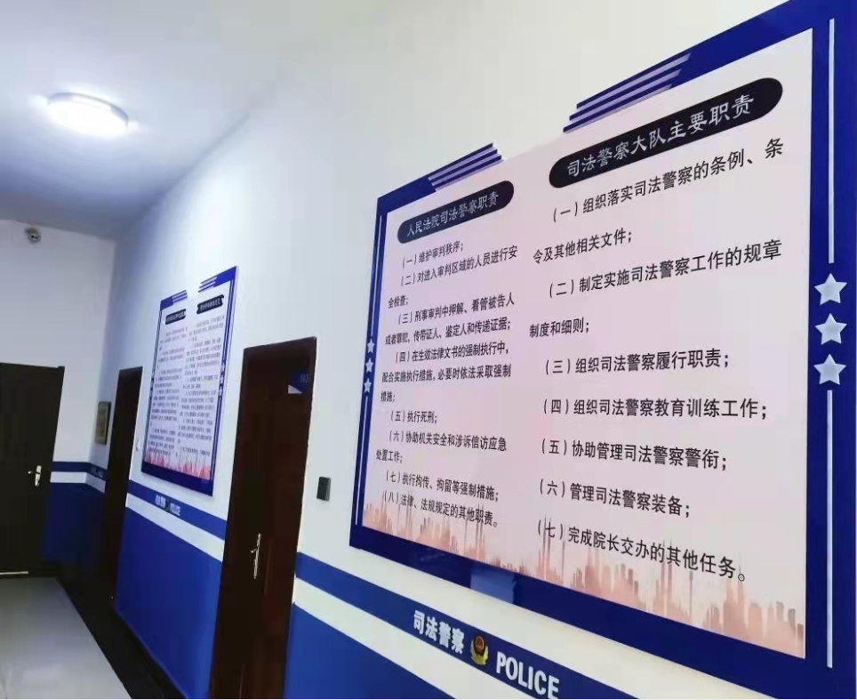 法官風采、警隊建設、廉政文化、干警作品、訴訟文化等內容。一樓大廳展示法官墻,為全院法官拍攝統一形象照片,用透明材質將全部法官照片全部上墻,突出司法透明這一理念;走廊建設司法警察文化長廊,集中展示司法警察誓詞、警隊風采、警隊人員與值班情況,以及警隊制度等內容;在立案庭懸掛立案流程和網上立案流程圖版,方便當事人了解訴訟流程。