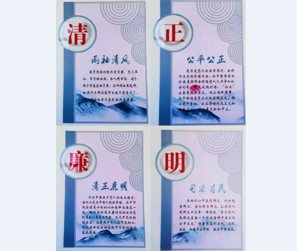 二樓計劃展示干警的文化作品,主要以書法、繪畫、詩詞等為主,目前正在收集當中。三樓打造了廉政文化長廊,集中展示法官法第五條對法官清正廉明的要求,營造風清氣正的濃厚氛圍,提高法官拒腐防變能力,打造了閱覽室,新進了法律、人事、財務、宣傳、紀檢等方面的工具書300余冊,為法院干警學習提供場地,改善干警學習環境,全力推進“書香法院”建設。
