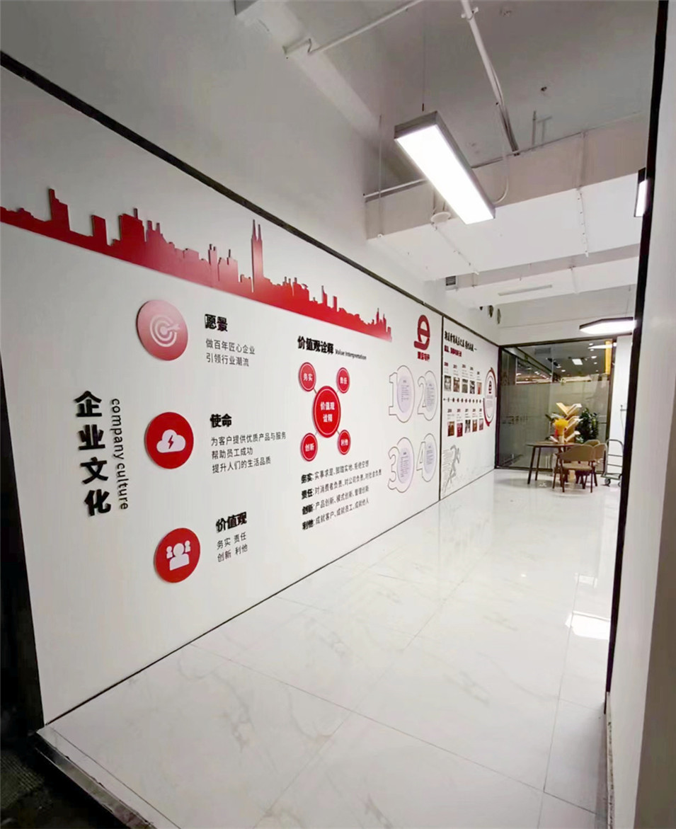 因此:我們建議采用封閉玻璃的設計方案,讓這道墻體變的厚重,擯棄而不是常規所見:貼磨砂紙噴繪,貼透明車貼,貼超透貼UV打印等等,這些表面貼文化墻廣告制作物料思路,不能從根本上提升整個前臺區的文化體驗。
